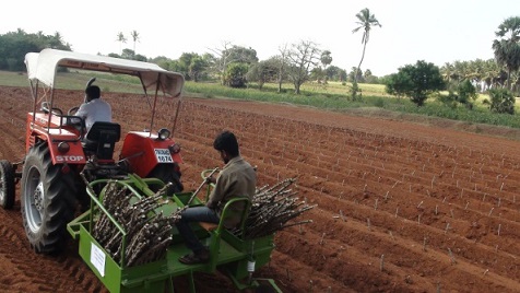 A tractor operated single row cassava stake cutter planter has been developed consisting of main frame, stake cutting system, stake planting mechanism, transmission system and ridger. The equipment when in operation (attached to a 35-40 hp tractor) forms a single ridge with the cassava stem cut in to stakes and planted on top of the ridge vertically at a metered distance of 45 cm. The actual field capacity of the planter is 0.18 ha/h. It saves 60 per cent in cost when compared to manual planting.